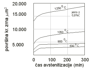 Pri previsoki temperaturi, zaradi povečanih difuzijskih procesov, se več kristalnih zrn združi v eno večje. Pri ohlajanju, iz enega kristalnega zrna, nastane le eno perlitno zrno. Nastala grobozrnatost se odpravi le s ponovnim normalizacijskim žarjenjem. Razogličenje in oksidacija se preprečijo z izbiro ustrezne zaščitne atmosfere. Iz spodnjega diagrama je razvidno, da na velikost kristalnega zrna bistveno bolj vpliva temperatura kot pa čas avstenizacije. Po avstenizaciji pri 1050°C je kristalno zrno dvakrat večje kot je pri 830°C.