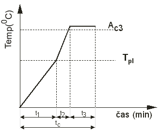 Notranje napetosti nastajajo do temperature plastičnosti materiala (Tpl). Nad to temperaturo so deformacije samo plastične in so lahko hitrosti segrevanja nekoliko večje. t2 = čas segrevanja z večjo hitrostjo t3 = čas zadrževanja na temperaturi avstenizacije. S tem se doseže izenačitev temperature po celem presek