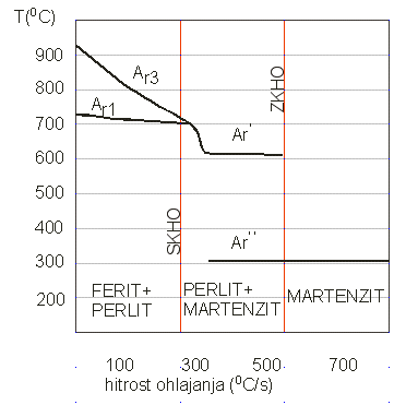 V takem primeru se transformacija izvrši hitro in pri stalni temperaturi. Ta hitrost se imenuje spodnja kritična hitrost ohlajanja (SPHO). Pri tej hitrosti se v strukturi začne pojavljati bainit. Transformacija se izvrši pri temperaturah pod 550°C. Pri nekoliko nižji temperaturi transformacije, pod 300°C, se pojavi nova črta, ki se označuje z Ar“. Pri še večji hitrosti ohlajanja črta Ar` izgine. V tem primeru, iz avstenita nastaja tipična kalilna struktura to je martenzit. Ta hitrost ohlajanja se imenuje zgornja kritična hitrost ohlajanja (ZKHO).