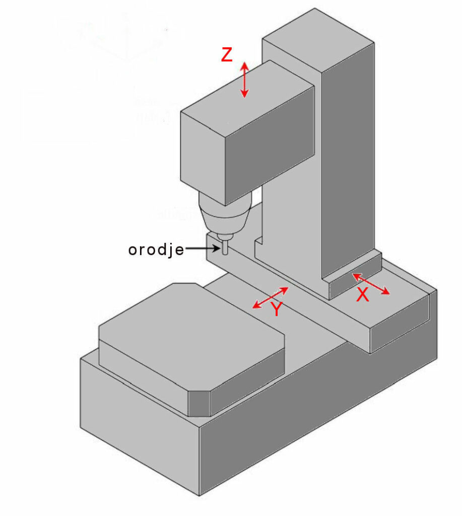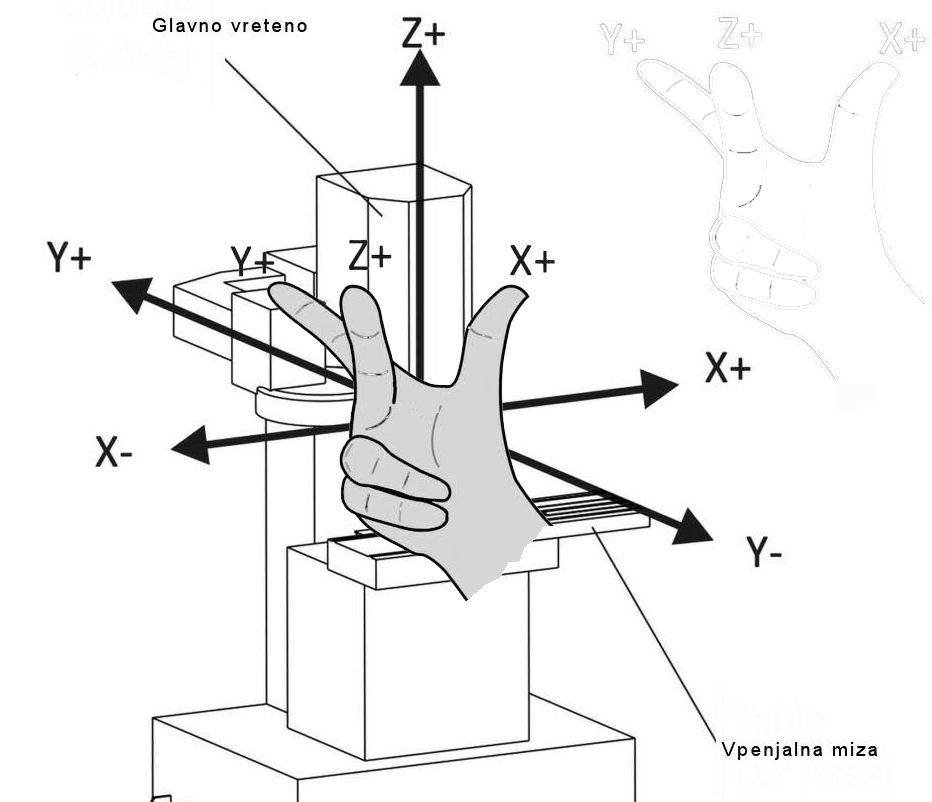 Z translacija je vedno v smeri glavnega vretena. X os je v smeri daljše stranice vpenjalne mize. Z os v smeri glavnega vretena.