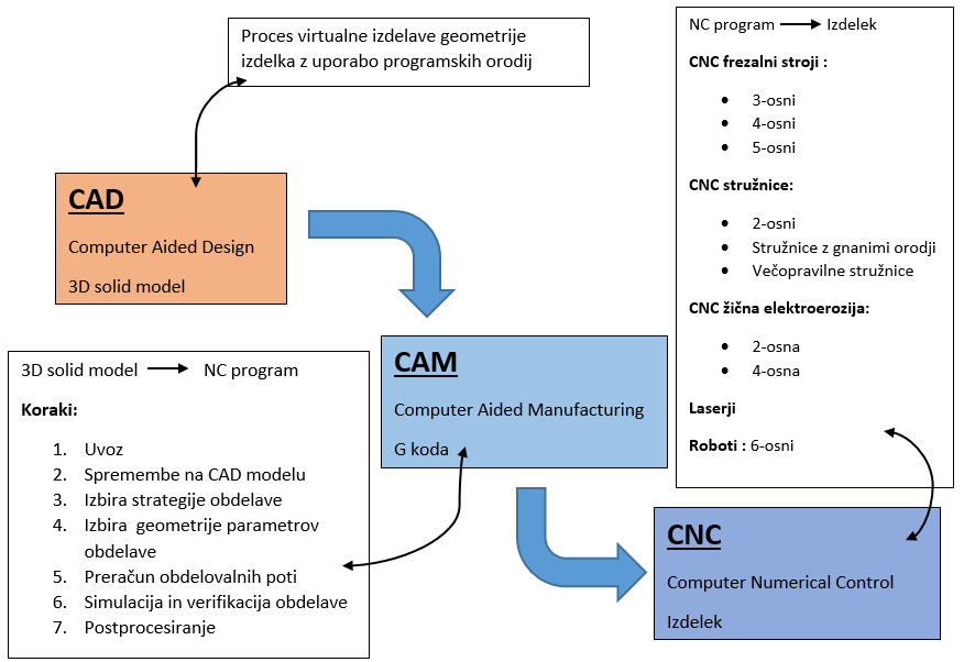 CAD (Computer-Aided Design), CAM (Computer-Aided Manufacturing), in CNC (Computer Numerical Control) so povezane tehnologije, ki se pogosto uporabljajo v industriji za oblikovanje in proizvodnjo. Tukaj je osnovna povezava med njimi: