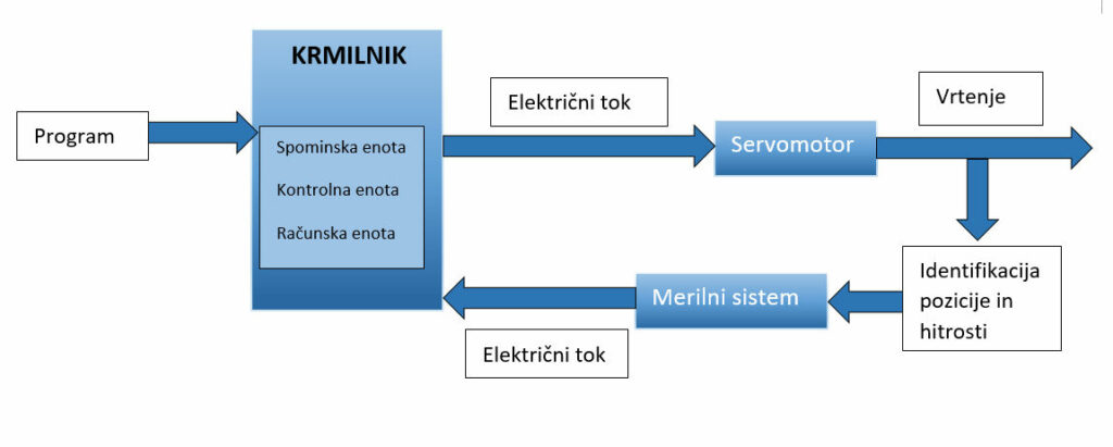 Krmilnik prečita prvi stavek programa in temu ustrezno priredi velikost in trajanje električnega toka, ki napaja servomotor. Servomotor se začne vrteti, ustrezno prečitanemu stavku. Trajanje električnega toka in velikost napajanja določita koliko časa in kako hitro se bo servomotor vrtel – temu torej ustreza hitrost in trajanje vrtenja glavnega vretena ali pa hitrost in trajanje pomika suporta. Potem ko je motor opravil to akcijo se prečita naslednji stavek in temu ustrezno se izvede naslednji gib. Toda, ker vedno nastopa neka nenatančnost (ohlapi), pri še tako natančno izdelanih vretenih, ležajih itd. je potrebno preverjati ali je zahtevano gibanje zares izvedeno. To opravlja merilni sistem, ki ugotavlja trenutni položaj orodja ali posamezne enote stroja (npr. suporta). Merilni sistem so običajno t.i, merilne letve, ki so pritrjene na stroj in se uporabljajo za ugotavljanje pozicije in hitrosti pri linearnem gibanju ali pa tahogeneratorji, ki se uporabljajo za ugotavljanje pozicije in hitrosti vrtilnega gibanja. Podatke prenaša krmilniku, ki zaznava razliko med zahtevanim in dejanskim položajem orodja. Dokler ta razlika obstaja krmilnik daje signal za električni tok, ki napaja servomotor, vse dokler se razlika ne izenači. Ko se razlika izenači (merilni sistem je izmeril, daje npr. suport opravil takšno pot kot je zahteval krmilni stavek), potem krmilnik prečita naslednji stavek.