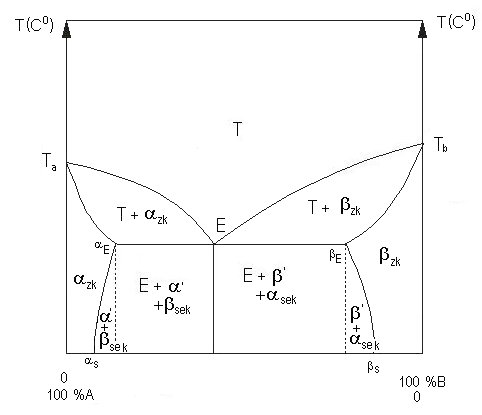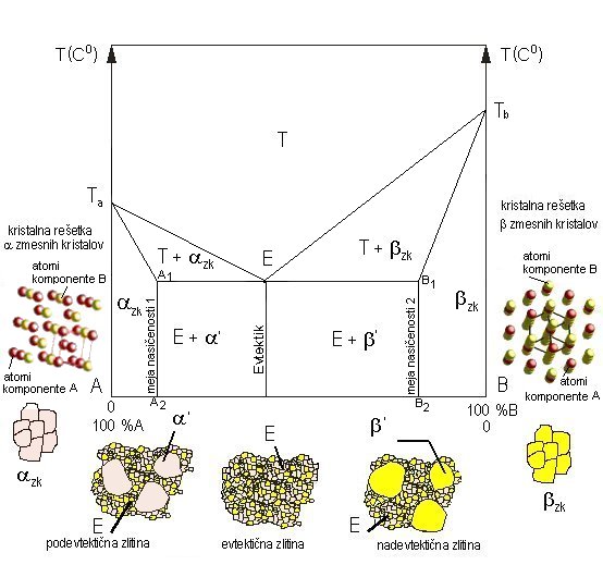 E – evtektik, mehanska zmes (finozrnata) nasičenih zmesnih kristalov a ¢in b ¢.