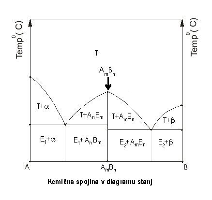 Pri sestavi A = m % in B = n % komponenti tvorita kemično spojino, ki ima svojo kristalno zgradbo in lastnosti. V diagramu na skici je taka zlitina označena z AmBn.