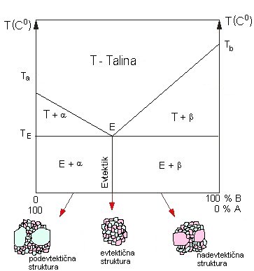 Vse zlitine kristalizirajo v temperaturnih intervalih med likvidus in solidus črtami. Izjema je le zlitina E, ki ima točno določeno kemično sestavo in kristalizira pri konstantni temperaturi Te . Ta zlitina se imenuje evtektična zlitina. Zgrajena je iz zelo drobnih kristalnih zrn obeh komponent, zato ima zelo dobre mehanske lastnosti.