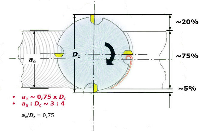 Če je frezalna glavo veliko manjša od obdelovanca, je priporočeno, da ne vstopamo direktno v obdelovanec, ampak v loku 1/2 do 1/4 premera frezalne glave. S tem zmanjšamo obremenitev prvega zoba. Če gremo naravnost, je nekaj časa prvi zob zelo obremenjen, ker nista po dva zoba v kontaktu. Frezalna glava je zelo nestabilna . Dostikrat se potem zgodi, da se na frezalni glavi poškoduje samo en zob, ostali pa so celi.