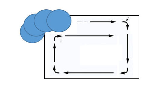 Ko pridemo do vogala, se ne ustavimo in spremenimo smer za 90 stopinj. To pot tudi izpeljemo v radiusu, malo zmanjšamo pomik, in izpeljemo skozi ovinek brez ustavljanja. Pri čelnem frezanju vedno delamo približno z 2/3 premera. Izogibamo se frezabju s celim premerom. To pa zato, da imamo dovolj prostora, da grejo odrezki ven. Če delamo s celim premerom so  obremenitve zelo velike in lahko pride do loma orodja.