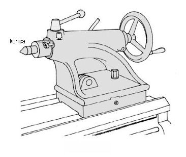 Konjiček lahko premaknemo za nekaj mm tudi v prečni smeri, kar nam omogoča tudi struženje stožcev z majhnim kotom.