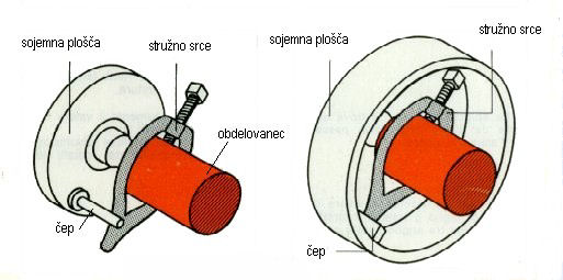 Ta način vpenjanja uporabljamo za dolge valjaste obdelovance. Na obdelovanec pritrdimo stružno srce, ki se z enim delom naslanja na sojemno ploščo s čepom. Prek čepa se vrtilno gibanje iz delovnega vretena prenaša na obdelovanec.