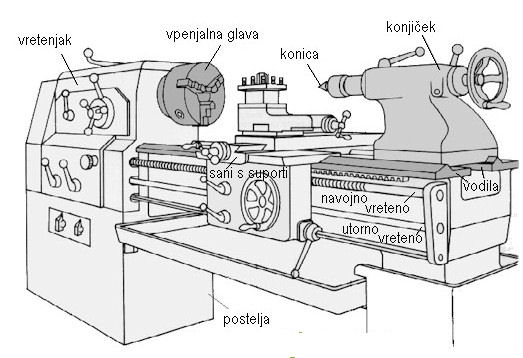 Postelja – povezuje glavne sestavne dele v celoto. Skoraj vedno je iz sive litine, ker ima ta material dobre livne sposobnosti in ker ima ogljik v obliki grafita, kar daje sivi litini dobre drsne lastnosti. V bistvu imamo na postelji obdelanih dvoje ploskev: drsne in nosilne ploskve. Drsne ploskve predstavljajo vodila, po katerih drse sani s suporti in na drugi strani še konjiček. Vodila so tudi ustrezno termično obdelana. Postelja mora biti ustrezno toga , odstranjevanje odrezkov naj bo lahko, vodila pa morajo biti zaščitena pred padajočomi odrezki.