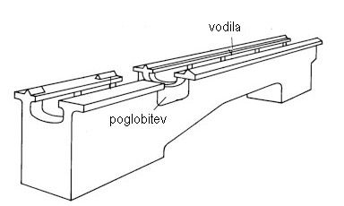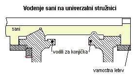 Slika nam prikazuje izvedbo vodil, ki imajo varnostni letvi za preprečevanje privzdigovanja drsnika. Pri stružnici je vodilo kombinacija nesimetričnega-prizmatičnega in ploščatega vodila. Varnostni letvi sta pritrjeni z vijaki. Na zgornji strani postelje so tudi vodila za konjiček, ki pa tu ni narisan. Ta vodila so kombinacija ploščatega in simetrično-ploščatega vodila