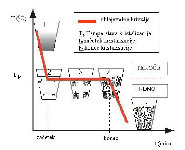 Pri prehodu materialov iz tekočega (neurejenega) v trdno (urejeno) stanje mora oddati en del svoje notranje energije. Oddana energija povzroča, da je temperatura taline med urejanjem približno enaka. Potek kristalizacije pri ohlajanju je najbolj razviden iz ohlajevalnih krivulj.