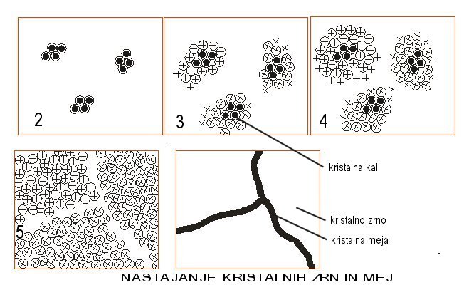 Zaradi poljubnih leg kristalnih kali in različnih začetnih smeri kristalizacije se pri koncu kristalizacije pojavijo velike nepravilnosti. Določena mesta bodo ostala nezasedena, nekatere smeri kristalizacije se deformirajo. Ti neurejeni vmesni prostori, v katerih se strnejo posamezne “fronte” kristalizacije, se imenujejo kristalne meje. Njihova širina je nekaj atomskih premerov. Prostor, ki je nastal s kristalizacijo iz ene kristalne kali, se imenuje kristalno zrno.