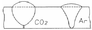 Zvar narejen s CO2 je bistveno širši, pri argonu pa ožji in globlji.