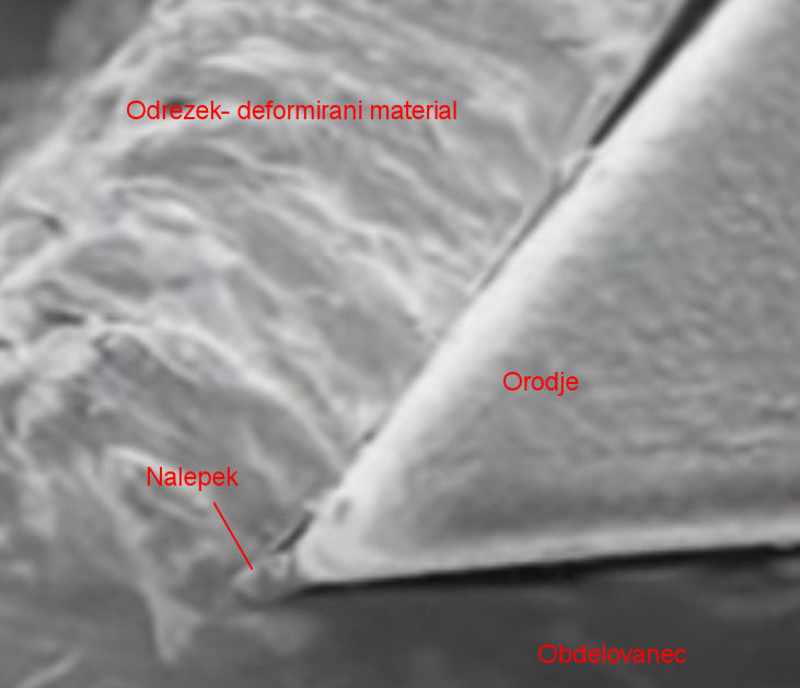 c) Difuzija: prehajanje materiala med obdelovancem in rezalnim orodjem na atomski ravni. Zaradi izmenjave atomov med obdelovancem in rezalnim orodjem se poslabšajo lastnosti materiala na delih orodja, kjer prihaja do difuzije.