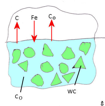 Pri karbidnih trdinah atomi železa prehajajo iz obdelovanca v orodno karbidno trdino, atomi kobalta pa iz orodja v obdelovanec. V material obdelovanca lahko iz volframovega karbida difundirajo tudi razmeroma mobilni atomi ogljika. Rezultat je pozmanjševanju pobstojnosti lastnosti orodnega materiala ter pospešena obraba različnih vrst. Difuzijo je mogoče učinkovito preprečiti z orodnimi prevlekami.