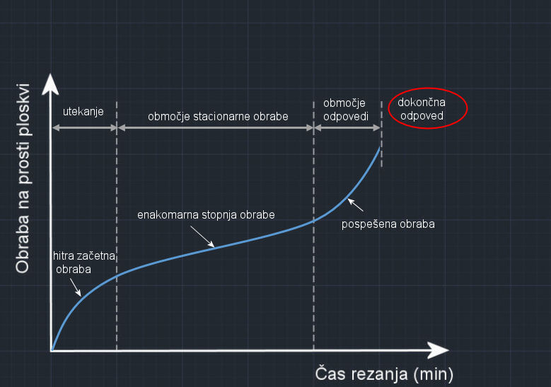 Postopno slabšanje orodja zaradi napredujoče obrabe je sestavljeno iz treh faz, kot prikazuje desna slika. Obraba orodja v začetni fazi napreduje razmeroma hitro. V drugi fazi napreduje s približno konstantno hitrostjo, v tretji fazi pa se spet pospeši ter konča z lomom rezalnega roba. Obrabo orodja lahko definiramo kot čas rezanja do prehoda v tretjo fazo obrabe, torej kot število minut, po katerem obraba ni več nadzorovana in zato ni mogoče napovedati delovanja rezalnega roba.