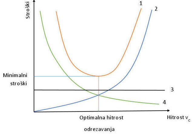 Kolikor hitreje delamo, toliko večji so stroški za brušenje in zamenjavo orodja, saj je obraba večja; nižji pa so pri tem stroški za stroj, saj naredimo več izdelkov. Presek obeh krivulj nam da optimalno hitrost .