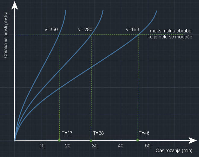 Graf primerjava obstojnosti in rezalne hitrosti, pri 400m/min bo ploščica zdržala 5 minut, pri 300m/min pa 12 minut in pri 200m/min pa 41 minut , v vseh primerih pa bo ploščica naredila isto število kosov.
