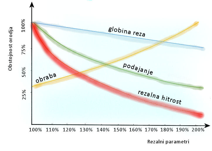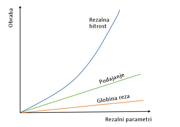 Največji vpliv na obrabo orodja ima rezalna hitrost, manjši je vpliv podajanja in najmanjši vpliv je globina reza.