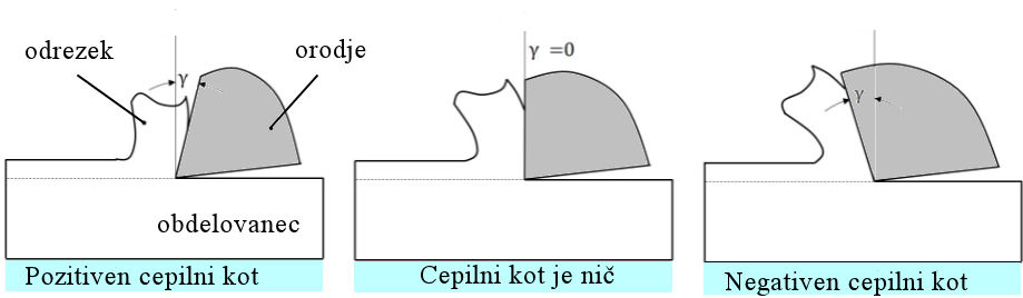 -Cepilni kot γ določa naklon cepilne ploskve orodja, ki se meri pravokotno na rezalni rob. Cepilni kot vpliva na lahkotnost odrezavanja (rezalne sile, nastajanje toplote …) ter na oblikovanje in tok odrezkov.