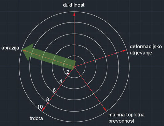 5. Abrazivnost in nagnjenost k obrabi, povezano s trdoto. Rezalno orodje, ki obdeluje zelo abraziven material, je podvrženo visoki stopnji abrazivne obrabe. Abrazivna obraba nastopi, ko trda in groba površina drsi po mehkejši. Definirana je kot izguba materiala zaradi delovanja trdih delcev ali izstopajočih oblik, ki se premikajo po trdni površini pod vplivom zunanje sile. Abrazivno obrabo običajno klasificiramo glede na tip in pogoje kontakta. Za abrazivne materiale je značilna relativno visoka vsebnost abrazivnih in obrabnih delcev v prvotni kovini. Delci so pogosto zelo trdi karbidi ali oksidi, ki povzročajo abrazivno obrabo rezalnega orodja. Izbira materiala orodja je zato pogosto karbidna trdina, ki ima zadostno žilavost. Ker pa sta diamant in CBN super trda orodna materiala, se tudi pogosto uporabljata v aplikacijah z abrazivnimi obdelovanci.