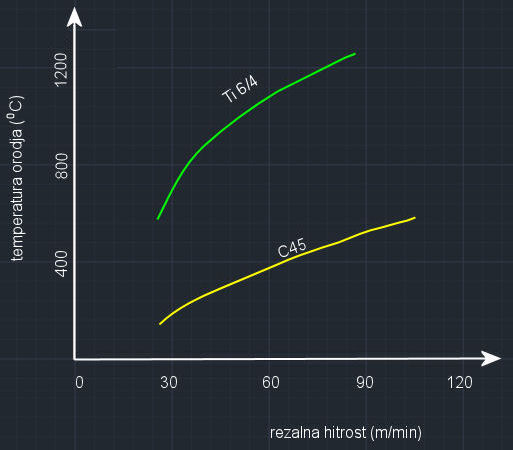 Želimo si da največ toplote gre z odrezki. Pri C45 ki ima dobro toplotno prevodnost (cca. 41W/mK) , gre največ toplote z odrezki in orodje se ne segreva. Pri titanu oziroma njegovi zlitini pa ne, ker ima majhno toplotno prevodnost je v bistvu izolator, zato gre več toplote na orodje in posledično se orodje več segreje. Zato je pomembno hlajenje.
