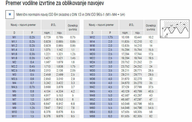 1. Iz tabel je potrebno izbrati ustrezno obliko strojnega navojnega svedra za material in tip izvrtine (prehodne ali slepe).