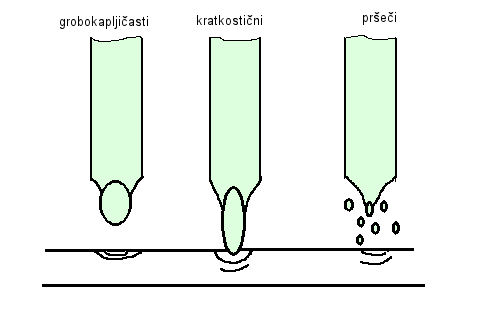 Število kapljic je 10 do 30 na sekundo. Značilno zanj so obžigi materiala in zajede ob zvaru.