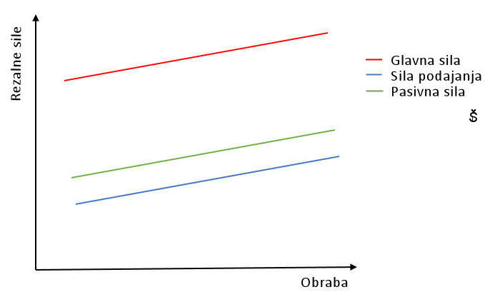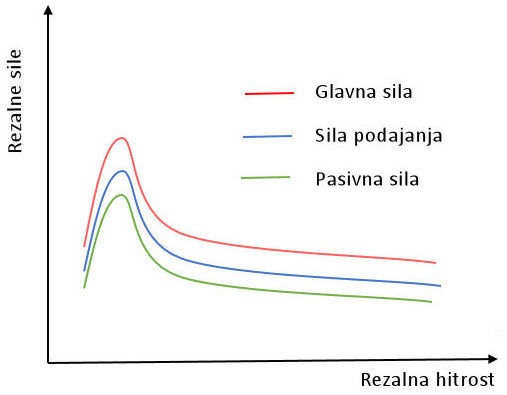 Rezalna hitrost (pravilno izbrana, tako da ni nalepka) nima opaznejšega vpliva na rezalne sile.
