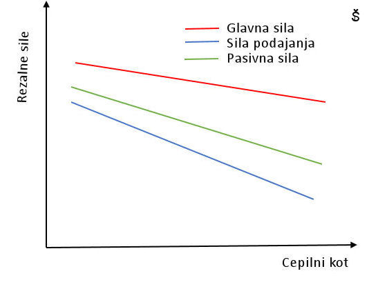Ko se poveča cepilni kot rezalnega orodja, se rezalne sile zmanjšajo. Odrezavanje z ostrejšimi orodji poteka bolj gladko, kar se odraža tudi v rezalnih silah. Odvisnost med cepilnim kotom in rezalnimi silami je linearna.