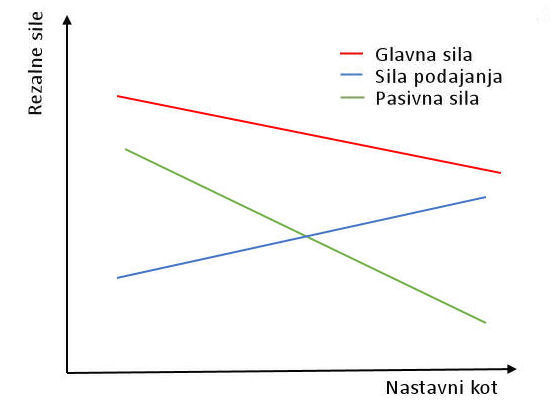S povečanjem nastavnega kota se zmanjšata glavna rezalna sila in pasivna sila, poveča pa se po- dajalna sila. Ob spremembi nastavnega kota pri nespremenjeni globini reza in podajanju se spremenita širina reza in debelina odrezka, s tem pa tudi sile pri rezanju.
