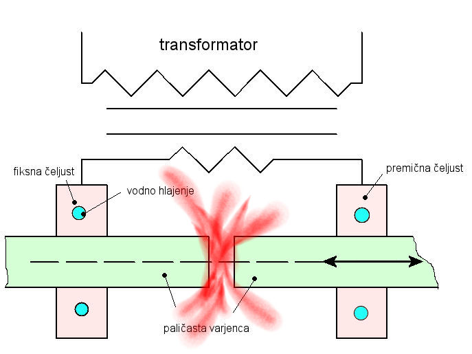 Je enaka kot pri soležnem postopku. Razlika je le v elektrodah, ki so tu močnejše in so vodno hlajene. Pri debelejših varjencev se uporablja še en par elektrod (čeljusti) iz jekla. Njihova naloga je razbremeniti Cu elektrode pri večjih meh. obremenitvah. Tudi varilni transformatorji so pri tem postopku večji in močnejši.