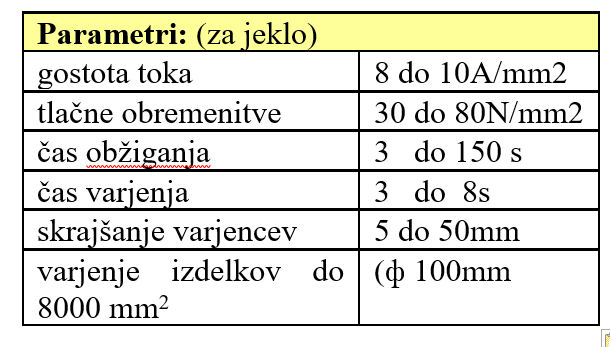 – Varjenje – varilni tok se izključi, sledi večji pritisk, pri katerem prihaja do večjega izstiskovanja segretega materiala. Pritisk se odstrani ko je zvar dovolj ohlajen.