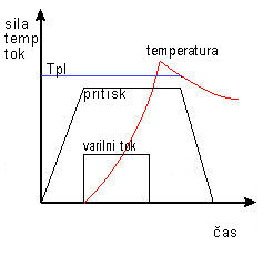 - Elektrode z določeno silo stisnejo varjenca, ki sta preklopno postavljena.