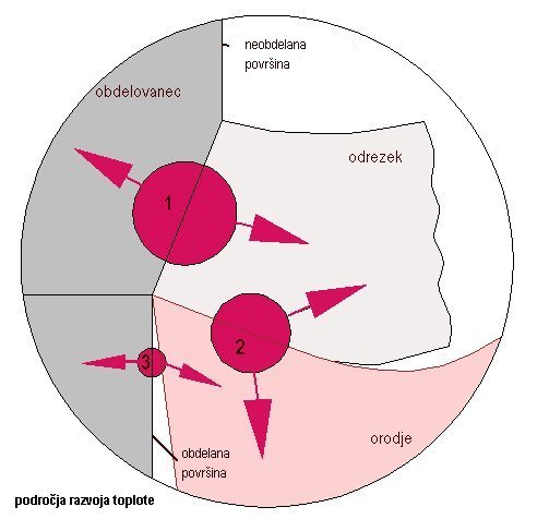Orodja so med odrezavanjem obremenjena s silami, ki so posledica deformacij pri nastajanju odrezka in trenja med orodjem in obdelovancem. Pri tem se razvija toplota, ki segreva orodje, odrezek in deloma obdelovanec.Toplota se razvije v treh conah :