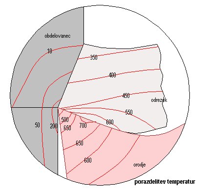 Slika desno nam prikazuje temperature do katerih se segreva obdelovanec odrezek in orodje. Posebno zanimiv je razpored temperatur s pomočjo izoterm . Pri tem je zanimivo, da največja temperatura na orodju nastane nekoliko odmaknjeno na cepilni ploskvi, kjer tudi nastopi obraba v obliki kotanje.