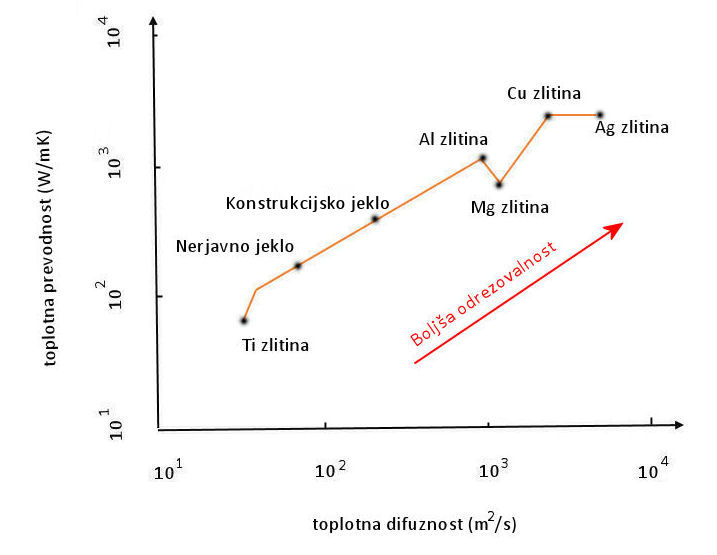 Manjša ko je toplotna prevodnost obdelovanega materiala, manjši je toplotni tok v odrezke in več toplote preide v rezalni rob. Maksimalna temperatura rezalnega roba se zviša in obstojnost orodja se skrajša. Previsokim temperaturam rezalnega roba med odrezavanjem se lahko izognemo z zmanjšanjem rezalne hitrosti pri materialih z manjšo toplotno prevodnostjo
