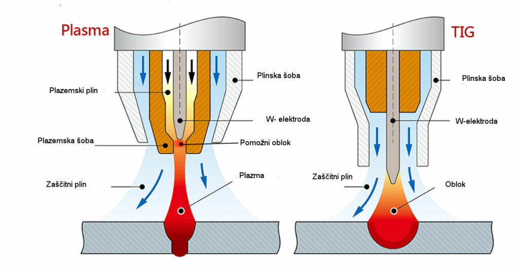 Eden za plazmo, ki izteka skozi notranjo in drugi za zaščito zvara, ki izteka skozi zunanjo šobo.