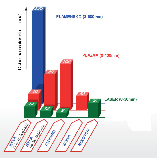 Pomožni oblok: 80 – 470 Glavni oblok: 80 – 200 Vžig pom. obloka: 7000 | N,H,CO2 ali mešanice, Za rezanje-zrak | -volfram -hafnij -cirkonij | – mikro plazma 0,1 do 15 -normalno 15 do 100 |