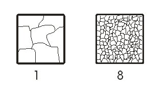 V tem primeru je velikost kristalnih zrn vzorca (okrogla slika), enaka velikosti kristalnega zrna v peti (pravokotna) sliki primerjalne tabele.