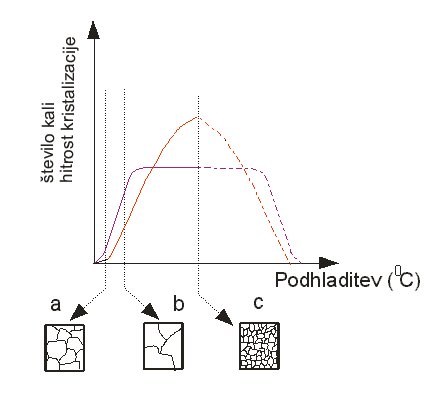 Vpliv podhladitve na hitrost kristalizacije in nastajanje kristalnih kali podaja spodnja skica. Z naraščanjem podhladitve se veča nastajanje števila kali in hitrost kristalizacije.