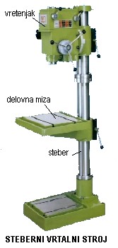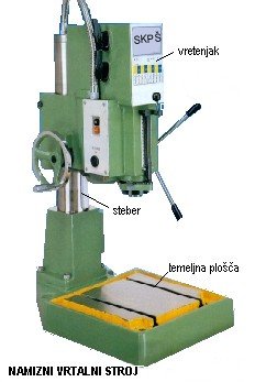 Za vrtanje izvrtin v jeklo do premera 25mm. Vretenjak je povezan s temeljno ploščo, na katero s pomočjo T utorov vpenjamo obdelovance. Glavno vreteno se vrti (glavno gibanje) v pinoli, ki se lahko aksialno pomika v vretenjaku (podajalno gibanje). Število vrtljajev glavnega vretena lahko menjamo s stopničastimi jermenicami ali – pri nekoliko izpopolnjenih strojih – s pomočjo zobniškega menjalnika.