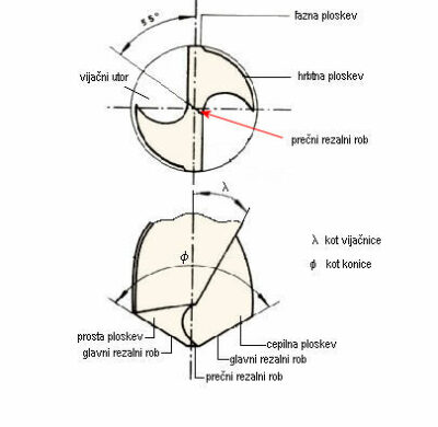 Vrh vijačnega svedra ima dve popolnoma enaki rezili. Iz slike so razvidni tudi posamezni nazivi in označbe posameznih delov vijačnega svedra.