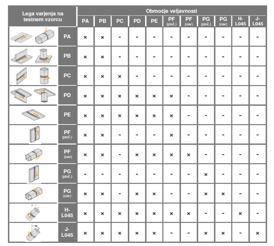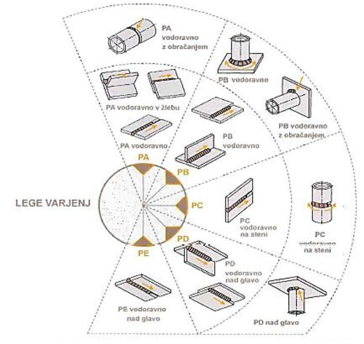 Standard SIST EN ISO 6947 definira delovne lege varjenja v prostoru glede na smer varjenja. Vsako varilno lego standard poimenuje z dvočrkovno oznako. Prva oznaka »P« pomeni pozicijo, druga črka pa ponazarja posamezno lego, začenši z »A«, ki označuje vodoravno lego. Tipične varilne lege na pločevini in cevi ponazarja slika